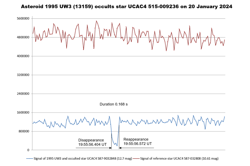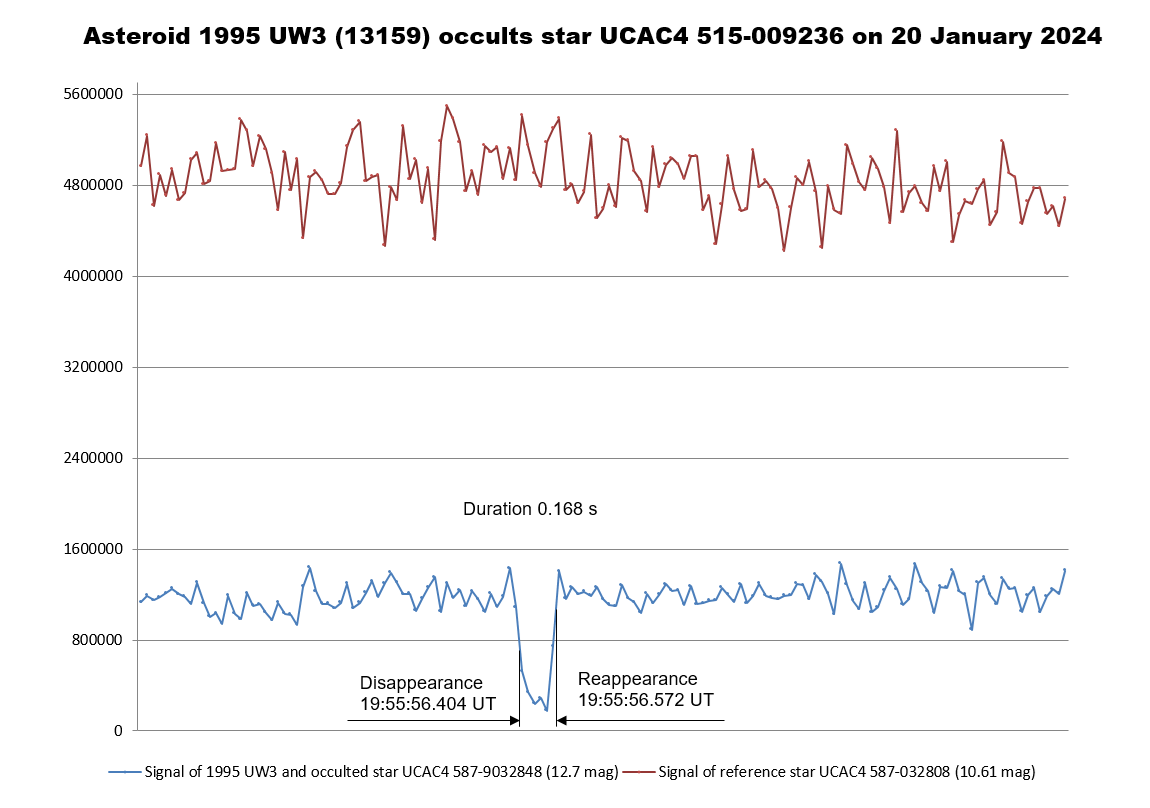 Dnes zákryt malého asteroidu 1995 UW3 - priemer má okolo 2,7km. Pri pozorovaní sa na svetelnej krivke objavili nevýrazné difrakčné javy.